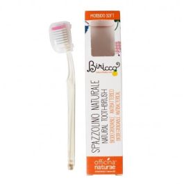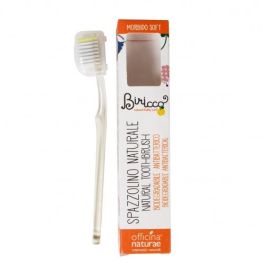 È uno spazzolino naturale perché ha il manico realizzato in materiale da risorsa vegetale rinnovabile ed è uno spazzolino con setole morbide, quindi ideale per bambini, in quanto rispetta le gengive e lo smalto dentale dei bimbi.