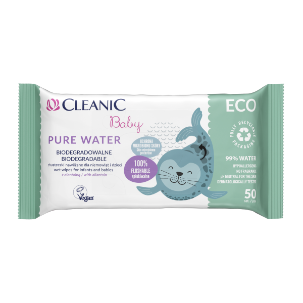 Le salviettine umidificate Cleanic Baby Pure water al 99% di acqua sono studiate per la pelle sensibile dei neonati. Le salviette sono realizzate in cotone e hanno una formulazione delicata. Per adattarsi alla pelle sensibile dei bambini, le salviette non contengono profumo o alcol e hanno un pH neutro per la pelle. Le salviette sono morbide e resistenti. L'imballaggio è riciclabile.